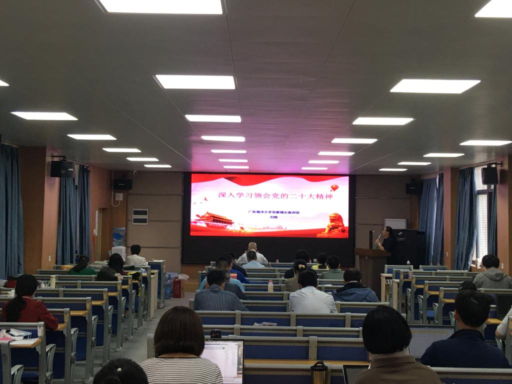 为深入学习宣传贯彻党的二十大精神,11月23日下午,海洋与气象公司党委在湖光校区海科楼107室举行学习贯彻党的二十大精神宣讲报告会,邀请公司党委理论宣讲团成员、马克思主义公司刘艳副教授作专辅导报告。报告会由公司党委书记陈晓主持,全体教职工参加了会议。