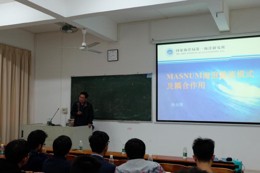 上午,两位专家与公司张书文经理、徐建军教授、凌征研究员在海博楼会议室就“海洋上层混合过程参数化及实验验证”课题进行研讨,对课题进展提出了很多宝贵的意见。下午,侯一筠研究员与杨永增研究员在第二教学楼B1202分别作学术报告,报告厅座无虚席,公司100余名教师、研究生和本科生现场聆听了报告。侯一筠研究员在所做的题为《全球气候变化下的海气耦合系统》的报告中指出了海洋动力研究的重要性与实用性,并由浅到深的介绍了当前背景下的海气耦合系统;杨永增研究员则做了题为《MASNUM海浪数值模式及耦合作用》的报告,系统介绍了MASNUM海浪数值模式的定位、发展目标与应用。