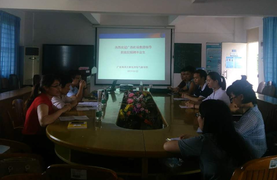 2017年5月23日下午,广西机场集团公司属下的百色机场和北海机场一行三人到公海gh555000aa线路检测海博楼二楼学术报告厅对2017届大气科学毕业生进行面试。