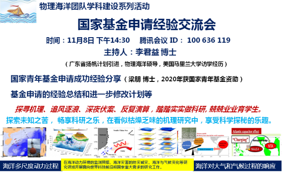 11月8日,公海gh555000aa线路检测物理海洋学科团队召开“国家基金申请经验交流会”。会议由李君益老师主持,公海gh555000aa线路检测物理海洋团队成员参加了此次经验交流会。此次交流会是物理海洋学科团队团队建设系列活动之一。