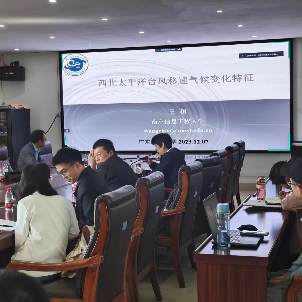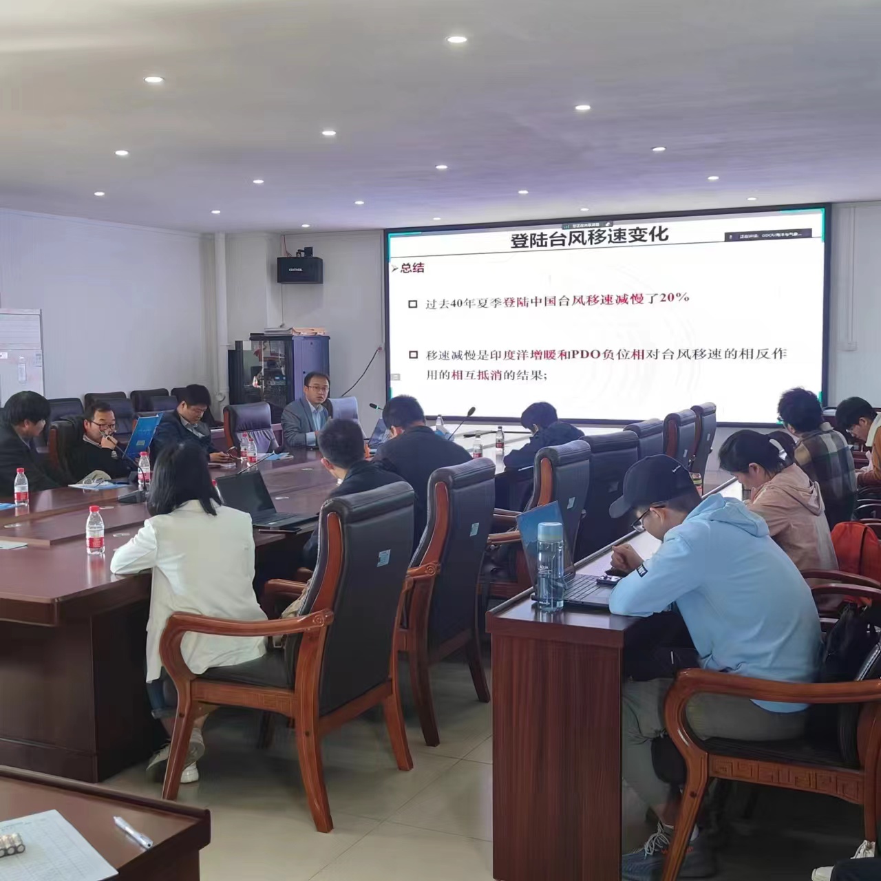 吴立广教授报告题目为:台风精细结构的数值模拟,他通过生动形象的例子深入浅出地讲解了龙卷尺度涡旋、台风眼墙极端上升气流、主雨带对流尺度结构、眼墙极端气压等内容。赵海坤教授报告题目为:热带波动在台风生成中的作用及其季节内预报尝试。他系统地讲解了季节内振荡对台风生成的大尺度调制作用、气候模式中的天气尺度波列、台风生成与热带波动的直接联系以及台风生成中季节内预报的尝试。曹剑教授对过去百年半球尺度季风降水的长期变化以及气温和气溶胶的对降水的影响进行了系统性的介绍。王超教授对西北太平洋台风移速的显著下降趋势进行了深入的探讨,并从引导气流和西北太平洋副热带高压两个方面进行了分析。几位教授同与会师生进行了热烈的学术讨论与交流,详细回答了公司师生提出的问题。此次学术讲座,开拓了师生们对台风领域以及季风降水的专业视野,对今后的学习、科研及学科发展有很大的启发和指导意义。