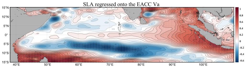 图1 热带印度洋 SLA(cm)与 EACC 经向流速异常(cm/s)的回归分析图。白点表示通过95%蒙特卡洛置信度检验的值。