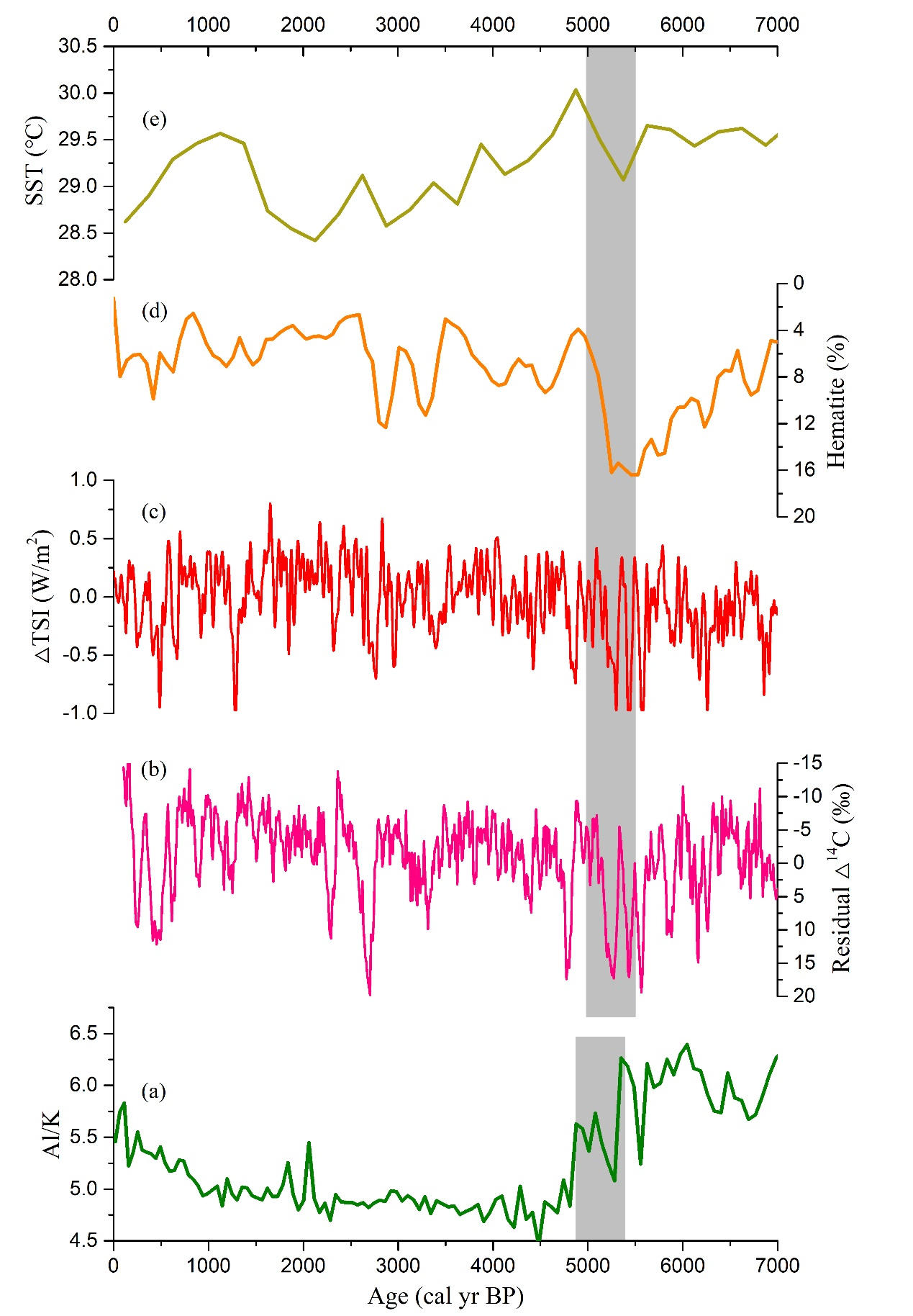 图2GH6岩芯记录与太阳活动指标(b和c)、北大西洋冰伐事件(d)以及ENSO活动指标(e)对比分析