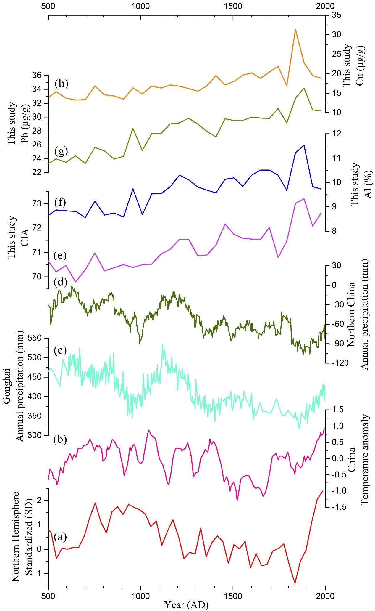 公司海洋地质团队成员黄超博士利用采自琼东海域大陆架GH6岩芯(图1),通过AMS14C测年建立岩芯的年龄–深度模式,进而开展高分辨的过去7000年气候演化与人类活动影响的重建工作。结果发现,在5400-4900calyrBP期间琼东地区发生了一次显著地气候突变事件,这与季风区其他研究发现的弱季风事件一致。该弱季风事件刚好与减弱的太阳活动、较强的ENSO活动以及北大西洋冰伐事件发生的时间吻合(图2),表明太阳活动可以通过影响ENSO系统和北大西洋对亚洲夏季风产生重要影响。近1500年以来,GH6岩芯记录的化学风化和陆源输入逐渐增强,且岩芯沉积物中的低频和频率磁化率大幅度增加,金属元素Cu和Pb的含量也迅速增加(图3)。这些岩芯沉积记录的增加趋势与海南岛的开发历史基本一致。然而,亚洲季风区多种地质载体的研究结果发现,夏季风在近1500年呈现整体减弱的变化(图3)。我们推测,由于人口的增加、农业生产的发展以及采矿冶炼活动的扩张,引起土壤侵蚀的增强和金属元素含量(Cu和Pb)的增加,进而导致陆源输入到近海陆架上沉积物的增加。因此,近1500年以来,琼东地区逐渐增强的人类活动取代了自然气候条件成为地表环境改造的主要控制力量。