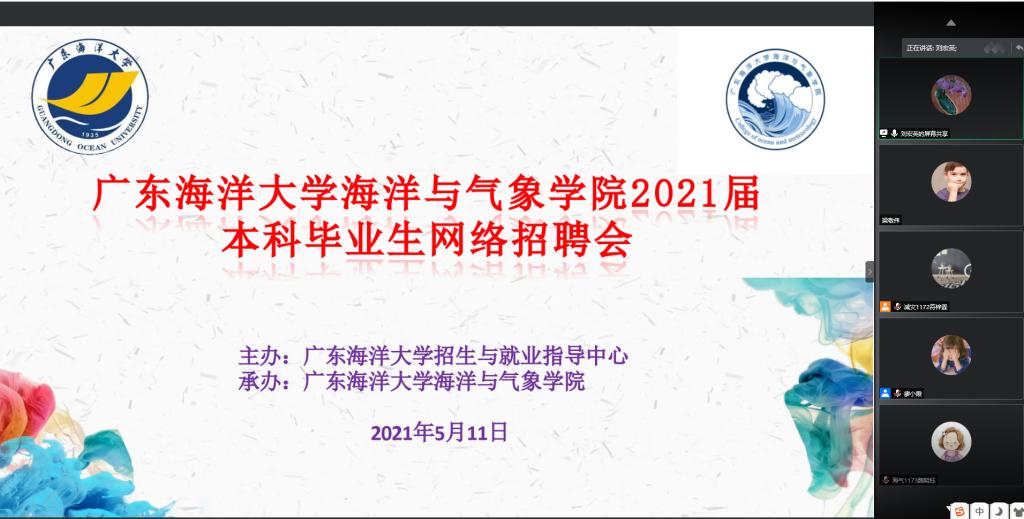 会上,刘宏英副书记首先对参加招聘宣讲会的用人单位代表表示热烈欢迎,对本次网络招聘会的筹备工作给予充分肯定,同时期望公海gh555000aa线路检测和各企业单位今后进一步开展深度合作。薛宇峰副经理介绍了公司和公司的发展概况,着重介绍了海洋科学、大气科学的团队建设、人才培养、以及社会服务等情况,指出了2021届毕业生面临的新的就业形势,鼓励毕业生抓住招聘会契机积极就业。分管毕业生就业工作的辅导员廖小霞对员工参加招聘会和积极主动就业提出了要求。随后,各用人单位按照会议安排有序进行宣讲,它们分别就公司背景、发展现状、招聘需求等内容为同学们做了精彩的讲解。