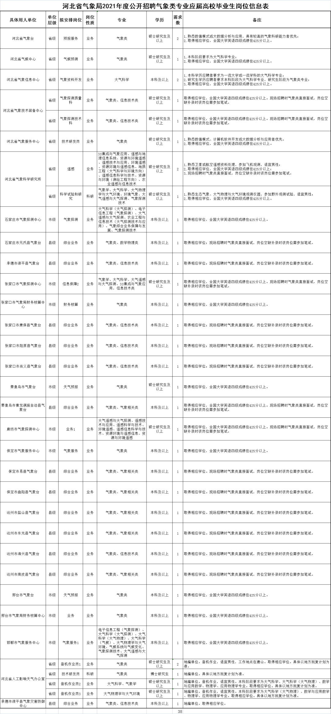 各招聘单位的招聘岗位、招聘人数、招聘岗位条件等详见《河北省气象局2021年度公开招聘气象类专业应届高校毕业生岗位信息表》(附件1)。专业根据中国气象局人事司《气象部门人员招录专业目录(2021年版)》(附件2)认定。
