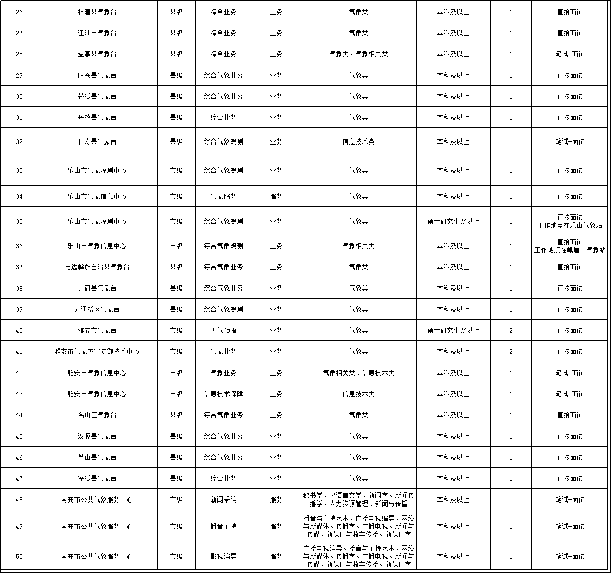 1.考试方式分为笔试 面试、直接面试两类,详见《四川省气象部门