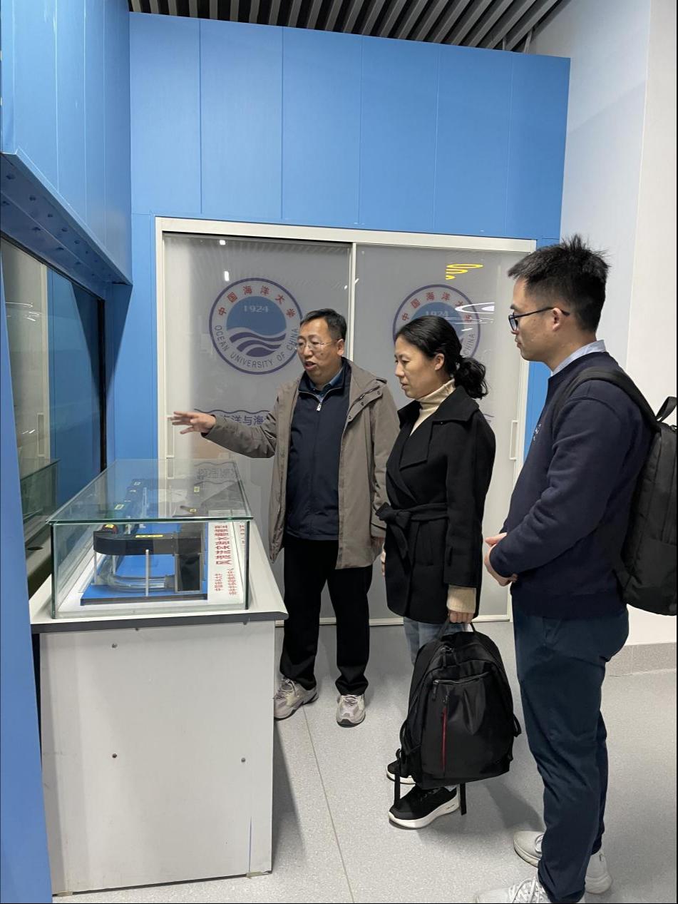 当天下午,侯庆华、胡耀强、李敏一行三人专程参观了中国海洋大学海洋学国家级实验教学示范中心。海洋与大气公司副经理陈旭热情接待了来访的三人。他深入浅出地讲解了公司的发展历程,详细介绍了先进的海洋调查设备和多种创新型流体力学设备,并分享了实验室高效运行的管理模式与创新举措。双方就本-硕-博贯通的海洋科学实践创新型人才培养体系设置、课程优化、教学手段及管理模式进行了深入的探讨。