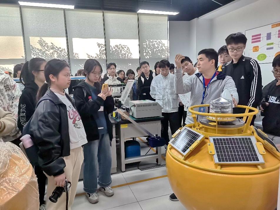 同学们接下来参观了广东海启星海洋科技有限公司,公司致力于推动新一代信息技术与海洋智能装备、海洋经济深度融合,打造标准化的产品研发和定制化服务体系。参观过程中,同学们在工程师的带领参观了公司展厅,工程师详细介绍了公司业务涉及到的重点技术,包括海洋动力灾害疏散路径智能规划系统、智慧渔业数字孪生平台等。同学们也参观了产品研发中心的一系列先进的海洋监测设备,主要包括分体式“永不沉没”浮标、自动气象观测系统、智能警戒潮位标识、新型验潮站、风暴潮监测站等。公司员工-公司技术副总工程师沈煜帆给同学们讲述了公司在海洋预警减灾、海洋生态环境保护、海洋观监测装备、海洋空间资源利用与保护等方面的重要成果,并与同学们就海洋科学专业学习心得和就业展开了热烈的讨论,极大的丰富了同学们对海洋科学实践应用的认识,同学们受益匪浅。