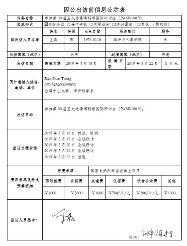 根据《关于进一步规范省部级以下国家工作人员因公临时出国的意见》的要求,现将公司因公出访相关信息予以公示。公示时间为2018年12月26日至30日。如有意见,请在公示期内,向公司反映。(院办电话:0759-2396055)