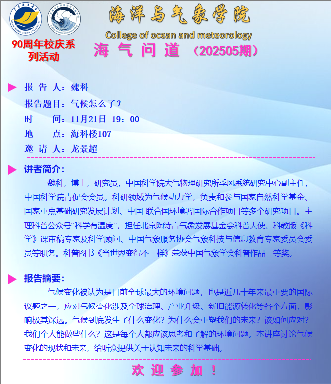 【学术报告通知】公海gh555000aa线路检测“海气问道”(202505期)
