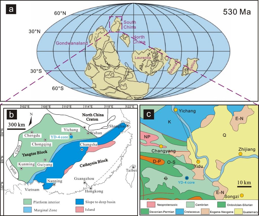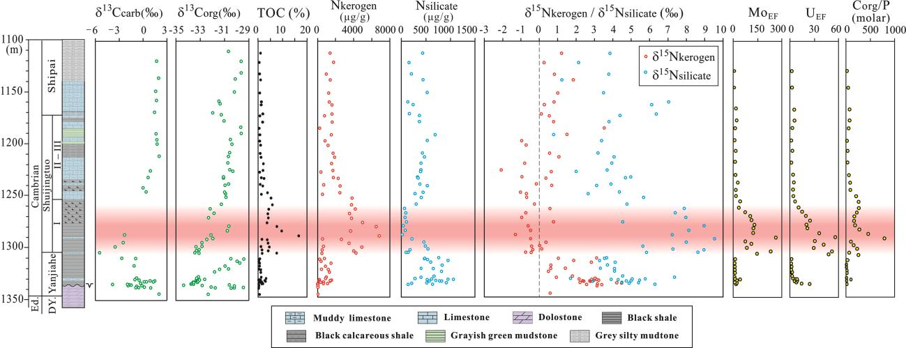 公司陈法锦教授、曹瀚升副教授及其课题组成员,以华南板块千米深钻为研究对象(图1),通过高分辨率硅酸盐结合氮(δ15Nsilicate)与干酪根结合氮(δ15Nkerogen)对华南扬子地块下寒武统严家河组至石牌组进行高分辨同位素分析,旨在揭示寒武纪早期古海洋氮循环过程及碳—氮循环耦合机制。