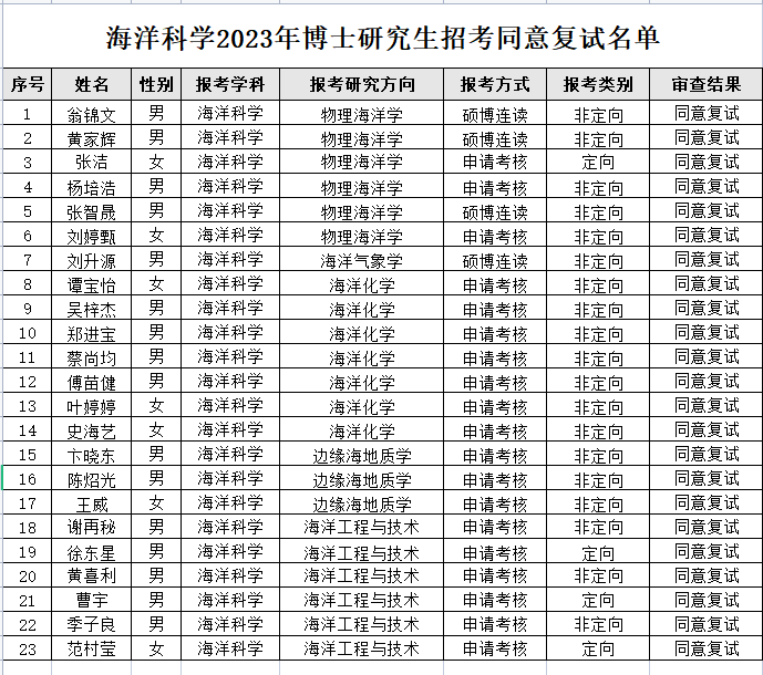 根据公司博士研究生招生录取有关文件的规定,结合《海洋科学学科2023年硕博连读与申请考核 招收博士研究生工作实施细则》的相关要求,现对海洋科学博士招考员工资格审查结果予以公示。