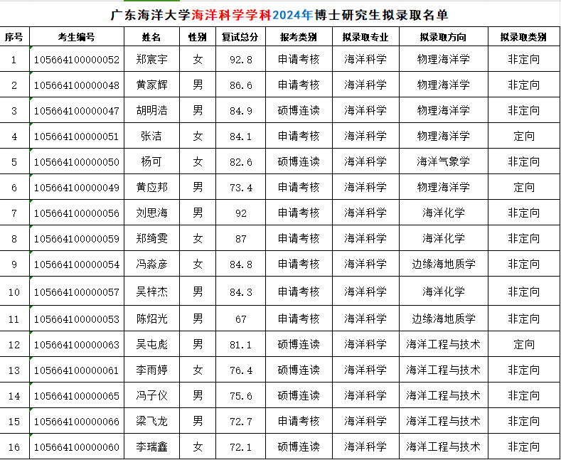 根据2024年博士研究生招生考试和录取工作方案、海洋科学学科2024年博士研究生招生考试工作方案,现将海洋科学2024年博士招生复试成绩及拟录取结果予以公示(见下图),公示期为10个工作日,即从2024年5月14日-5月28日。公示期内如有异议,请以真实姓名书面向海洋科学学位点建设委员会反馈。