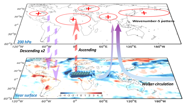 进一步的研究(Luo W. et al.,2024)证实热带太平洋-大西洋跨洋盆海温偶极子异常还可以通过影响大气环流异常形成在年际时间尺度上北美夏季风和北非夏季风之间的正相关关系(图28),从而产生北美夏季风与北非夏季风在年际变异上的显著同步性。