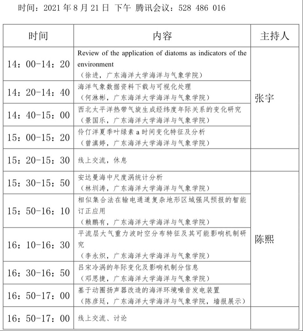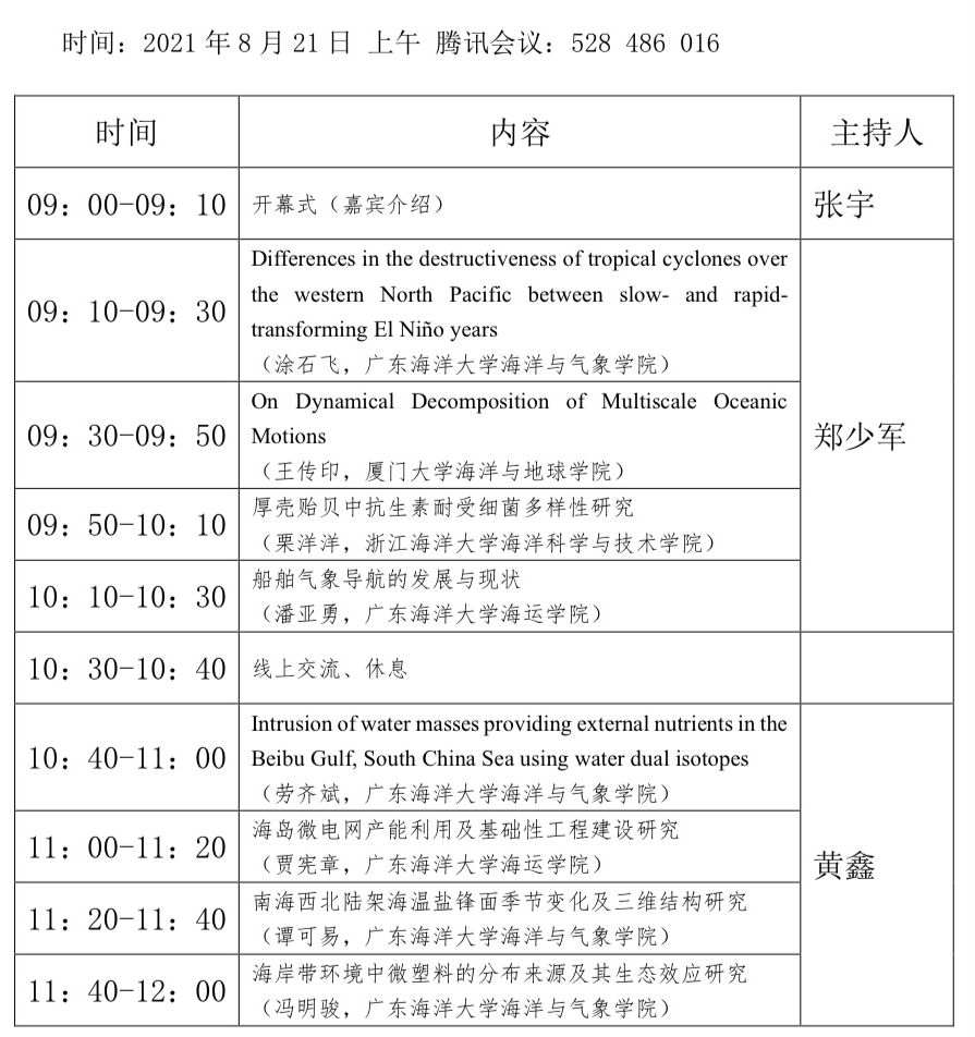 2021年8月21日,由公司与陆架及深远海气候、资源与环境广东省高等公司重点实验室主办的《2021年海洋科学青年创新论坛》于早上九点准时开始,参会人员100余人次,其中包括国内外高校及相关科研机构的本科、硕士与博士,以及学术声誉卓越的资深专家出席论坛,所有参会人员就汇报主题展开相关讨论。本次会议聚焦海洋科学相关热点问题,旨在培养青年科学家们发现问题、解决问题的创新精神及实践能力,进而加强学术沟通、学术交流。
