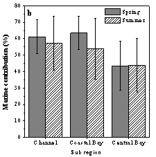 结果表明,湛江湾表层沉积物有机质受陆源输入和海洋自生的综合影响,其中海洋自生来源的有机质所占比例略高(海源有机质比例平均值:54.9%)。与湛江湾中部海域相比,湛江湾沿岸和支湾具有较的d13C和d15N数值、较高的TOC和TN浓度和较低的TOC/TN比值,说明湛江湾沿岸和支湾具有较高的初级生产力和较高比例的海源有机质。水产养殖、废水输入和清淤对于这些参数的空间变化有重要贡献。湛江湾表层沉积物有机质也具有明显的季节变化特征。在湛江湾支湾,夏季陆源有机质的比例比春季升高了10.2%;在湛江湾沿岸,夏季陆源有机质的比例比春季高26.0%。这一情况说明,夏季强降雨通过增加陆源径流给湛江湾支湾和沿岸带来了大量的陆源有机质。以上结果说明,湛江湾表层沉积物有机质受人类活动和环境变化影响明显。