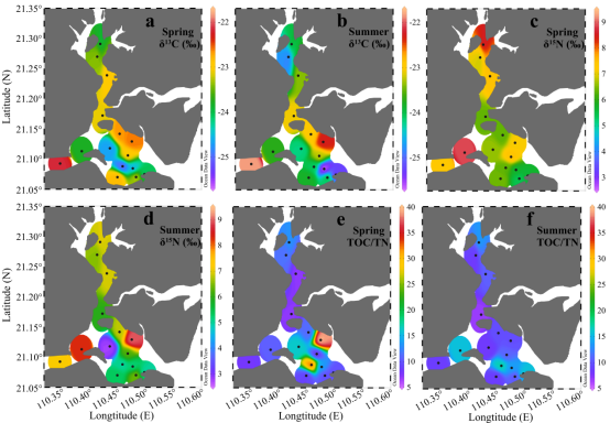 湛江湾位于南海西北部,是典型的口小覆大型海湾,沿岸人口密集。湛江湾具有亚热带海洋性季风气候,夏季的温度和降雨量较高,初级生产力也有明显的季节变化。该研究通过对春季和夏季湛江湾表层沉积物中有机碳(TOC)、总氮(TN)和碳、氮稳定同位素组成(δ13C和δ15N)的测定和分析,探讨了人类活动和环境变化对湛江湾表层沉积物有机质的空间分布和季节变化的影响。