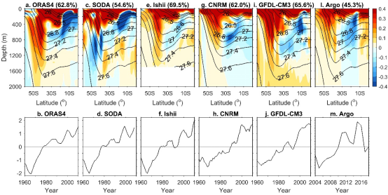 公司物理海洋学团队基于一系列再分析资料、模式输出和观测资料,发现南大洋正在经历的显著增暖可通过两种途径影响南印度洋次表层海水的热量再分配过程。首先,南大洋海表净热通量的增加导致了表层海水的增暖和局地更为深厚的对流层,通过抑制热带外大气的斜压不稳定迫使Hadley环流下沉支/西风带南移,进而在风应力旋度的驱动下整个副热带环流圈向极地偏移(图2),这导致南印度洋海水在位势密度槽的向赤道一侧变冷,向极地一侧变暖,产生图1所示的时空分布。