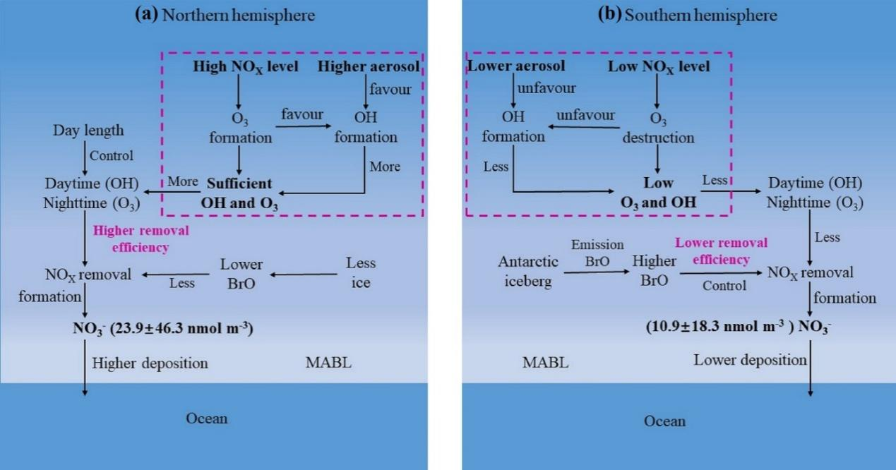 图1. 南半球和北半球海洋大气硝酸盐形成机制
