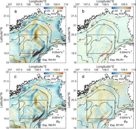 图1. 数值实验Exp. R4 (a), R5 (b), R6 (c)及R7 (d)与实验Exp. R1模拟的2014年6月北部湾内深度平均流的差异。图中箭头指示流速的变化方向,颜色代表流速的变化量值,黑色方框标识出北部湾夏季冷水团所在位置,红线为断面EF。
