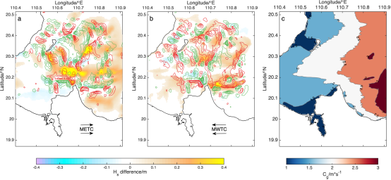 图2. (a)东向最大潮流的散度场(红色等值线标识辐聚,绿色等值线标记辐散)及其在琼州海峡东口处引发的有效波高变化(填色);(b)同(a),但为西向最大潮流作用下情形;(c)波浪群速度分布。注:(a)、(b)中有效波高变化在0.05m以内的区域未绘制。